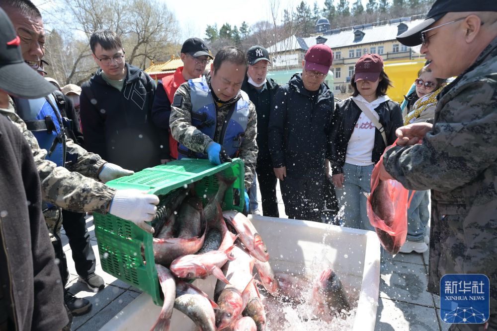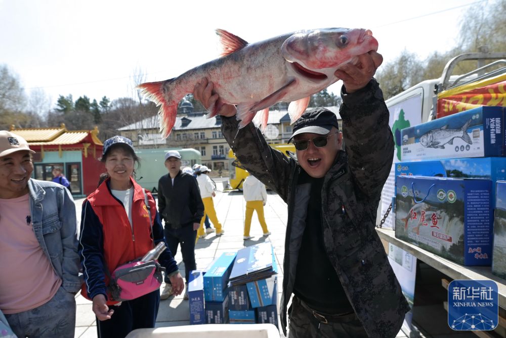 ↑ On April 20, staff display freshly caught lake fish at the "Lake-Opening Season" event in Jingpohu Lake Scenic Area, Mudanjiang City, Heilongjiang Province. Xinhua News Agency (Photo by Zhang Chunxiang)