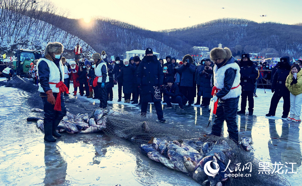 People's Daily Online, Mudanjiang, January 15 — On Jingpohu Lake in Mudanjiang, the ancient and mysterious fishing culture, passed down for millennia through traditions like "Awakening the Nets," "Toast for a Bountiful Harvest," and "Celebrating the Harvest," captivated visitors with melodious Mongolian songs and the rhythmic beats of drums and gongs. Led by the fishing chief, fishermen hauled in the nets, and with each spirited shout, silver carp and koi leaped vibrantly from the lake.