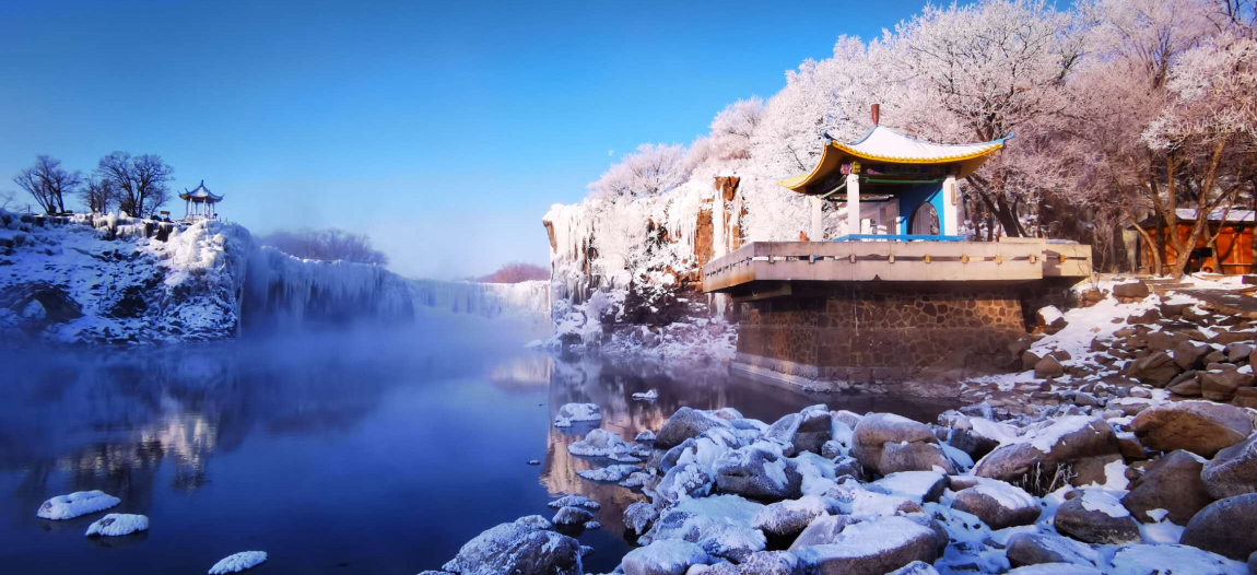 隆冬时节,镜泊湖吊水楼瀑布化作世界罕见的玄武岩冰瀑奇观。昔日奔涌的激流被严寒定格,百米崖壁上冰柱林立、冰帘垂悬、冰棱交错,如玉砌琼楼,似冰川圣殿。阳光穿射,冰体泛出幽蓝光泽,与崖下不冻的黑龙潭相映成趣,水雾升腾处,雾凇漫枝,宛若仙境。动静共生,冰火相融,这是大自然以时光为刀、以严寒为笔,镌刻出的冰雪史诗。