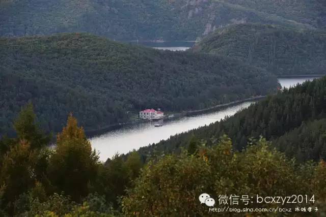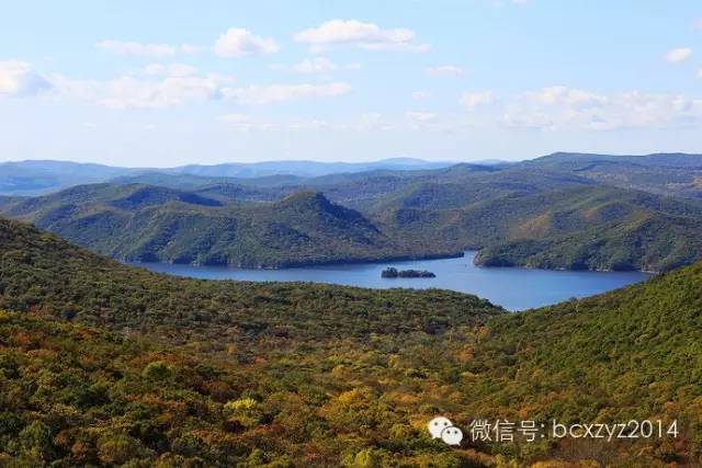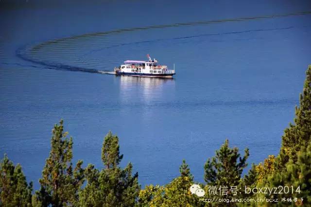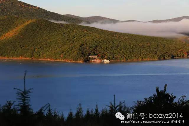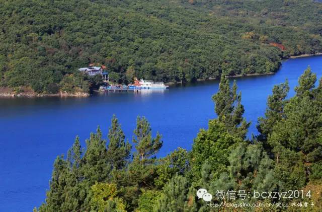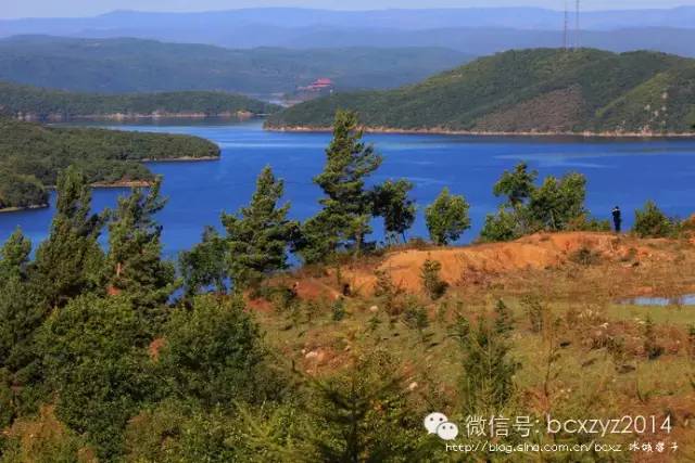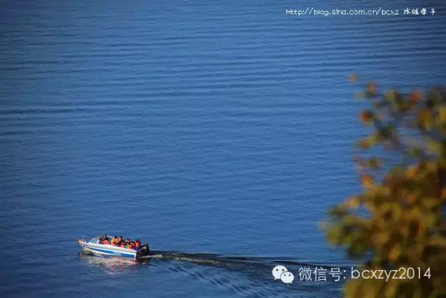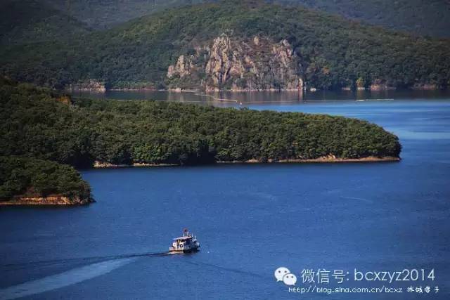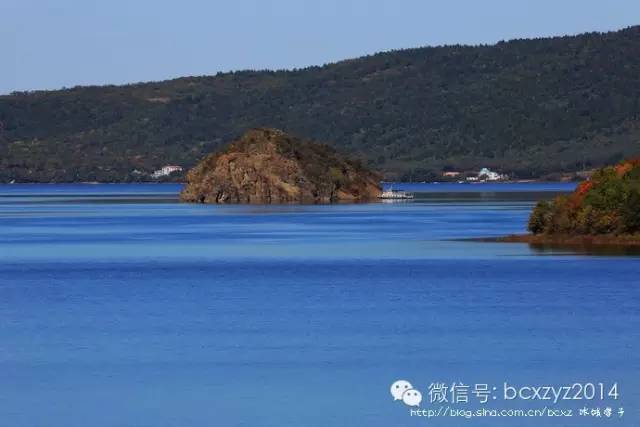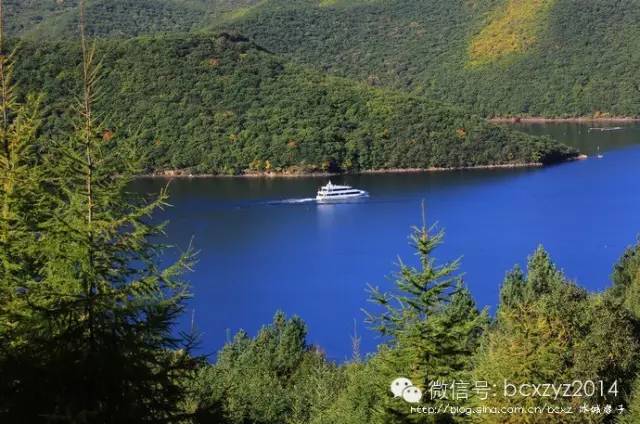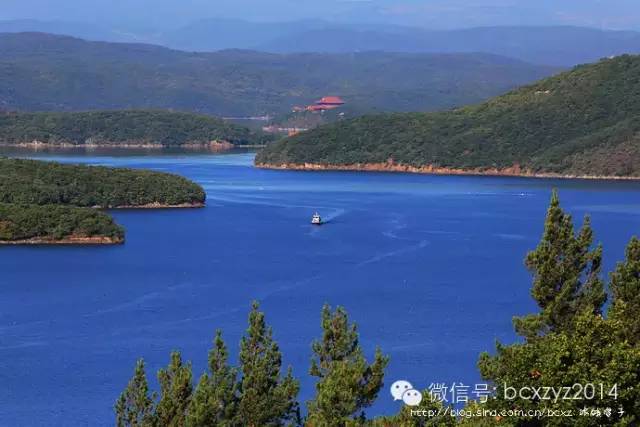车行在山间开始我们是要去风景区看湖水的,但山路旁林的间隙偶尔露出的那片蓝一下就照亮了我的心,迷离了我的双眼。这就是镜泊湖吗?这分明就是天池啊。我们在高山上,它们就静默在不远的青山间,好似一片碧蓝的丝绸铺在秋天凝重的草绿中。是那快艇的冲浪将湖面划出的波浪打破了这片静湖,让镜泊湖上生出了白色的花纹,就像在一块蔚蓝的丝绸上绣出的朵朵花儿。