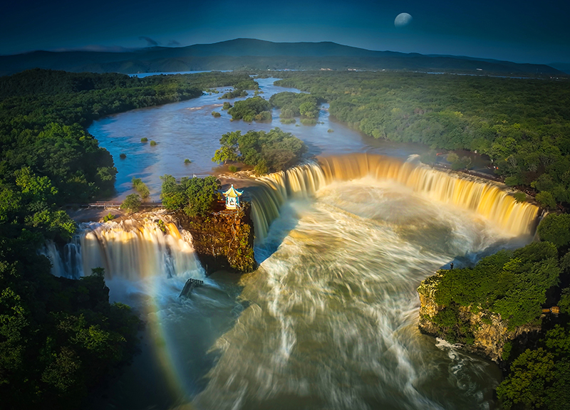吊水楼瀑布是中国三大瀑布之一,世界最大的玄武岩熔岩塌陷型瀑布,位于镜泊湖北湖山庄以北3公里处,是镜泊湖景区最著名的自然景观。平水期时瀑布一般宽幅50-60米,落差12米。但在汛期,瀑布会呈现出三面环水的壮观景象,瀑布呈多股跌落,落差大小不一,最大宽幅达300多米。湖水从南、西、北三个方向,以排山倒海之势,从熔岩壁顶直扑黑龙潭。似浮云堆雪,白雾四溅,百米之外,水珠扑面;如银河奔泻,彩练悬空,奔腾咆哮,气势磅礴。尤其是雨后,天晴气爽,艳阳普照,常有色彩斑斓的彩虹出现,为波澜壮阔的瀑布增添了一个靓点。有诗称赞它为“飞落千堆雪,雷鸣百里秋”。