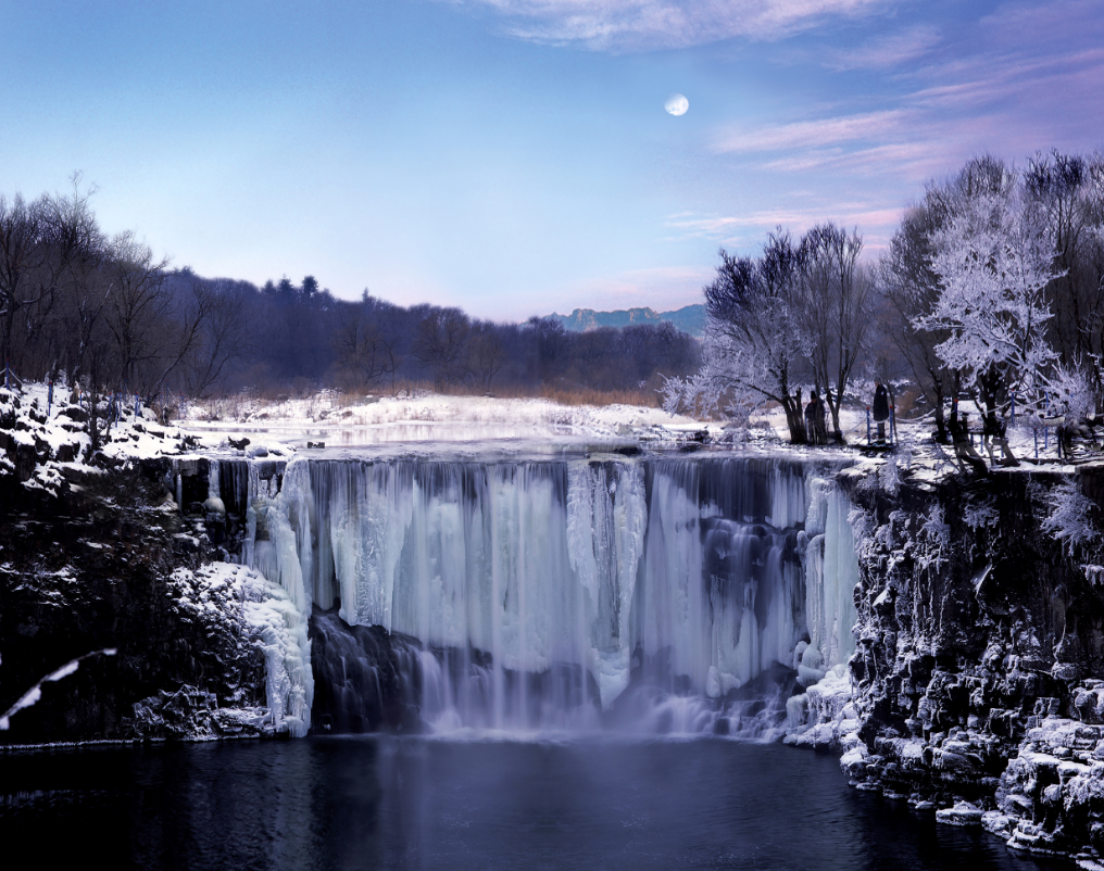冬季,吊水楼瀑布则会呈现出另一番至纯至美的罕见奇观——冰瀑。奔腾咆哮的的瀑布水幕逐渐定格,凝结如练,晶莹剔透,倒挂崖壁之上,在冬日暖阳的映照下,折射出熠熠的光彩。瀑布四周,雾凇环绕、玉树琼枝,终年不冻的黑龙潭流水潺潺,岚雾缥缈,恍若一方 “冰雪奇缘”的梦幻仙境。