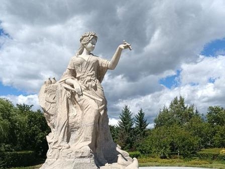 红罗女是牡丹江流域流传千年的民间传说人物(民俗学界定位为勤劳善良的渔家女)。传说中她持有能消灾弭祸的 “平波宝镜”,宝镜坠地化为镜泊湖。广场以这一传说为核心,融合靺鞨(渤海国)民族文化,用雕塑群将神话与历史具象化;园名由著名作家、中国民间文艺家协会主席冯骥才题写。